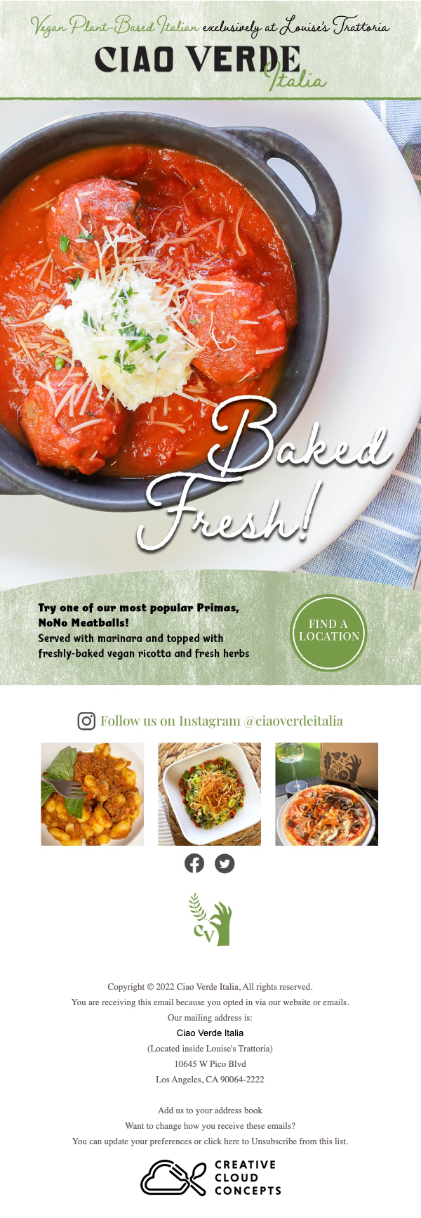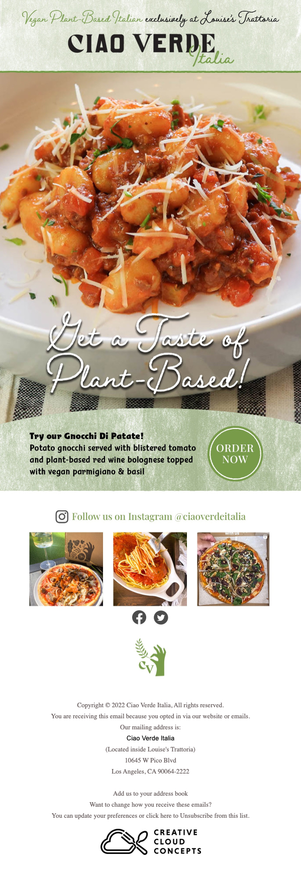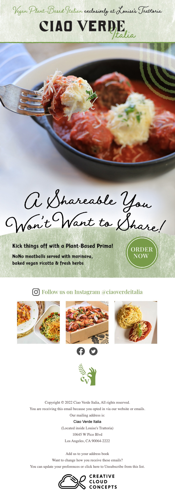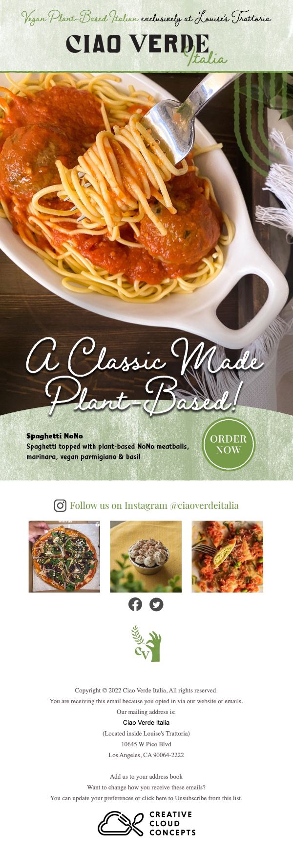 Ciao Verde Italia was a plant-based Italian ghost kitchen based in Los Angeles, CA.