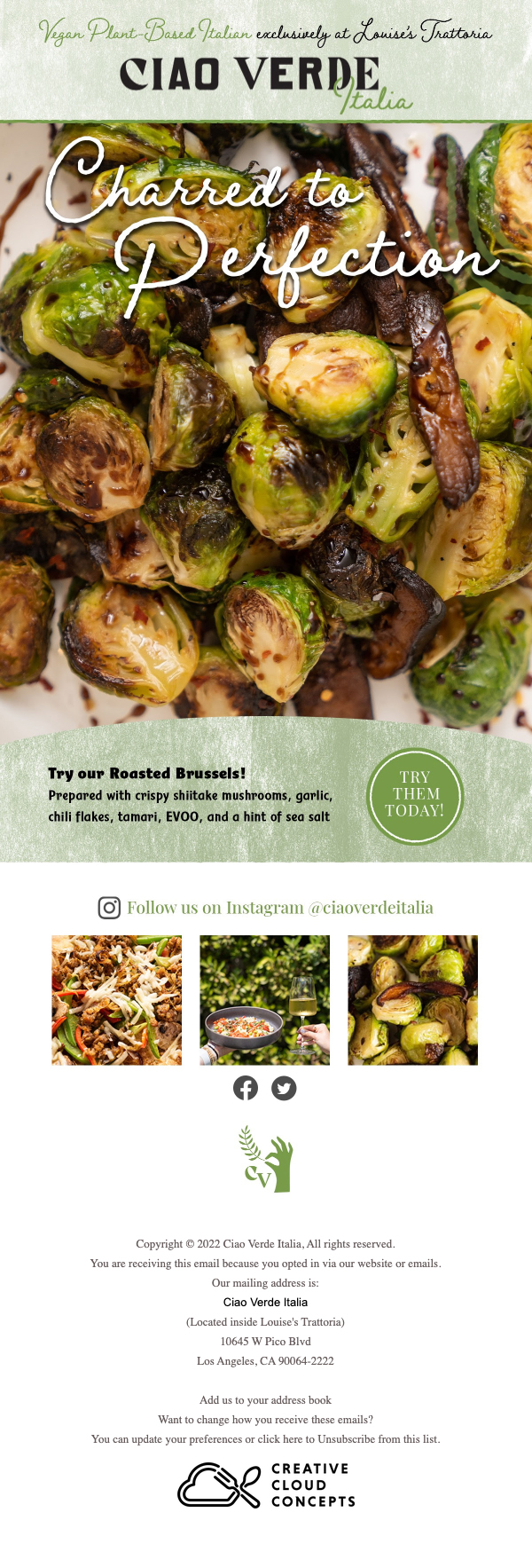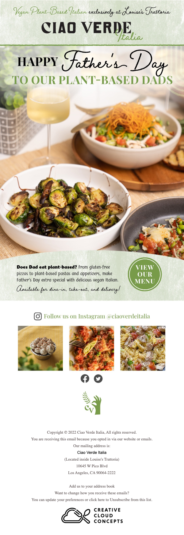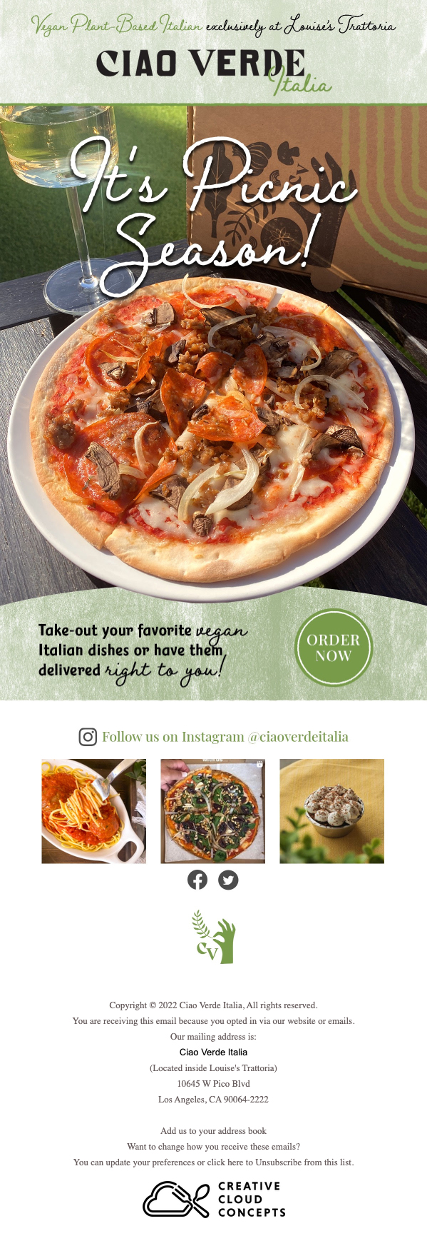 Ciao Verde Italia was a plant-based Italian ghost kitchen based in Los Angeles, CA.