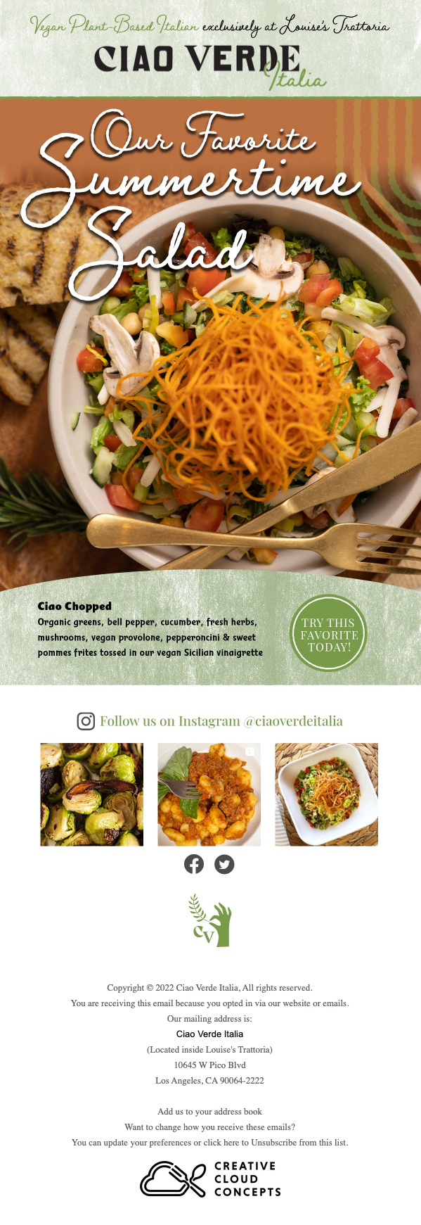 Newman Grace was the agency on record for Ciao Verde Italia, acting as their outsourced marketing department, for more than 3 years. As a part of the team at Newman Grace working for Ciao Verde Italia, our team worked on a wide range of projects including social media management, email campaigns (strategy, copywriting, design), promotional calendars, influencer campaign management, digital graphics, and print design.
