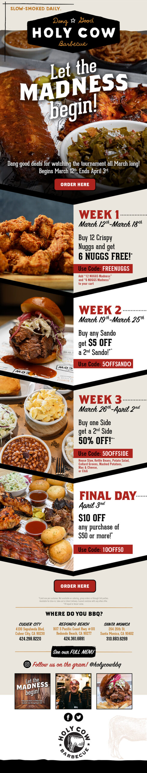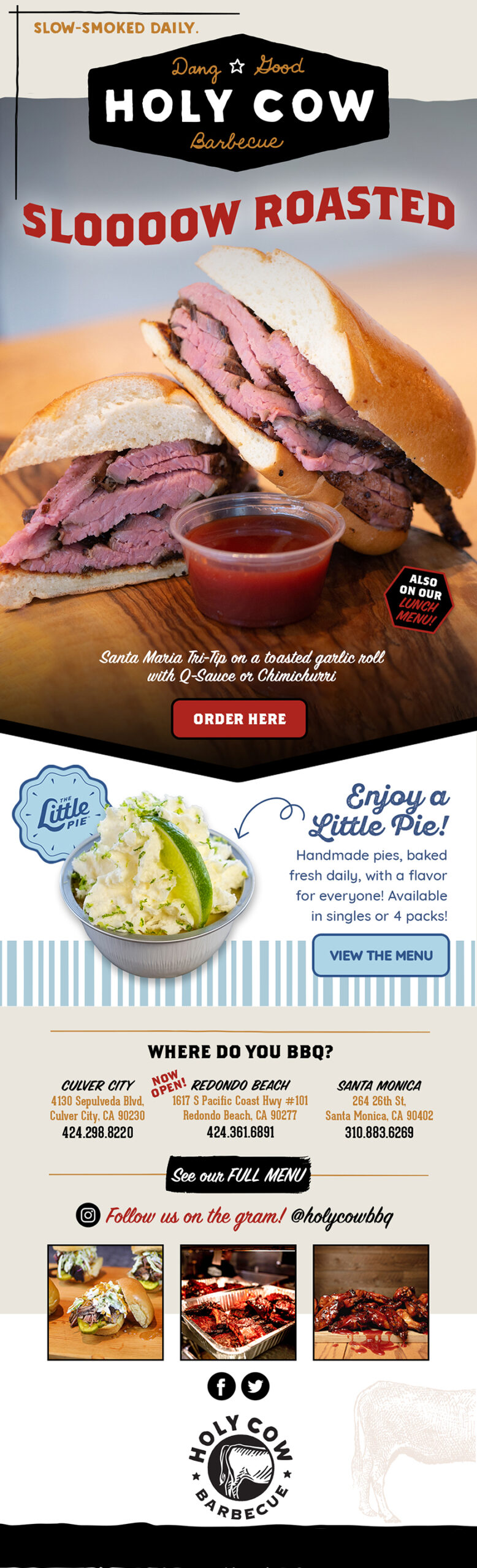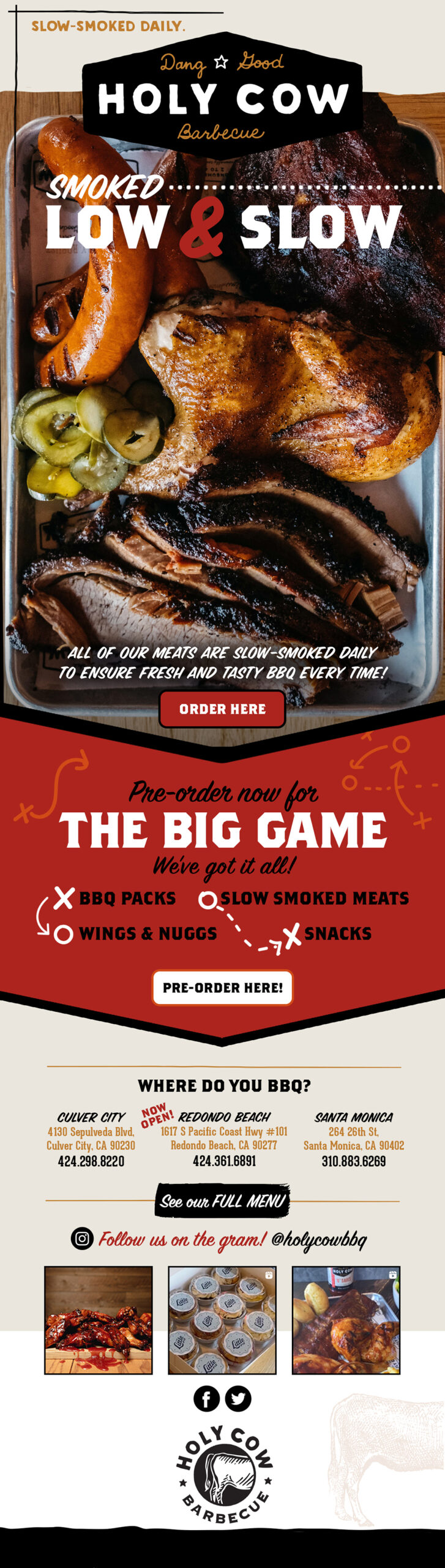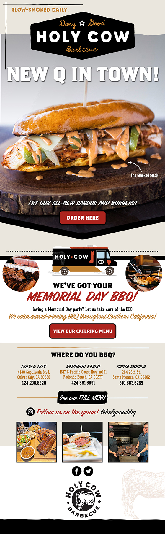 Newman Grace was the agency on record for Holy Cow BBQ, acting as their complete outsourced marketing department for 4 years. During this time, they owned and operated 3 locations and we managed the marketing & advertising for all 3 locations. As part of the marketing team for Holy Cow BBQ, I worked with our team to manage Holy Cow’s social media presence, strategize on promotions, planning/copywriting/designing promotional email campaigns, maintain & update their website, and strategize and execute in-store promotions.