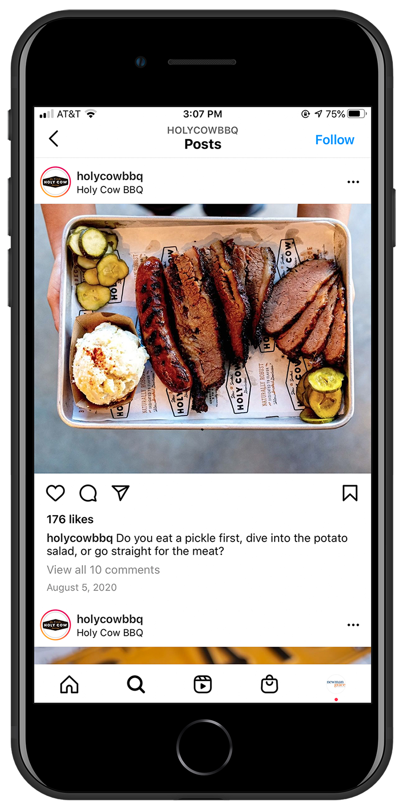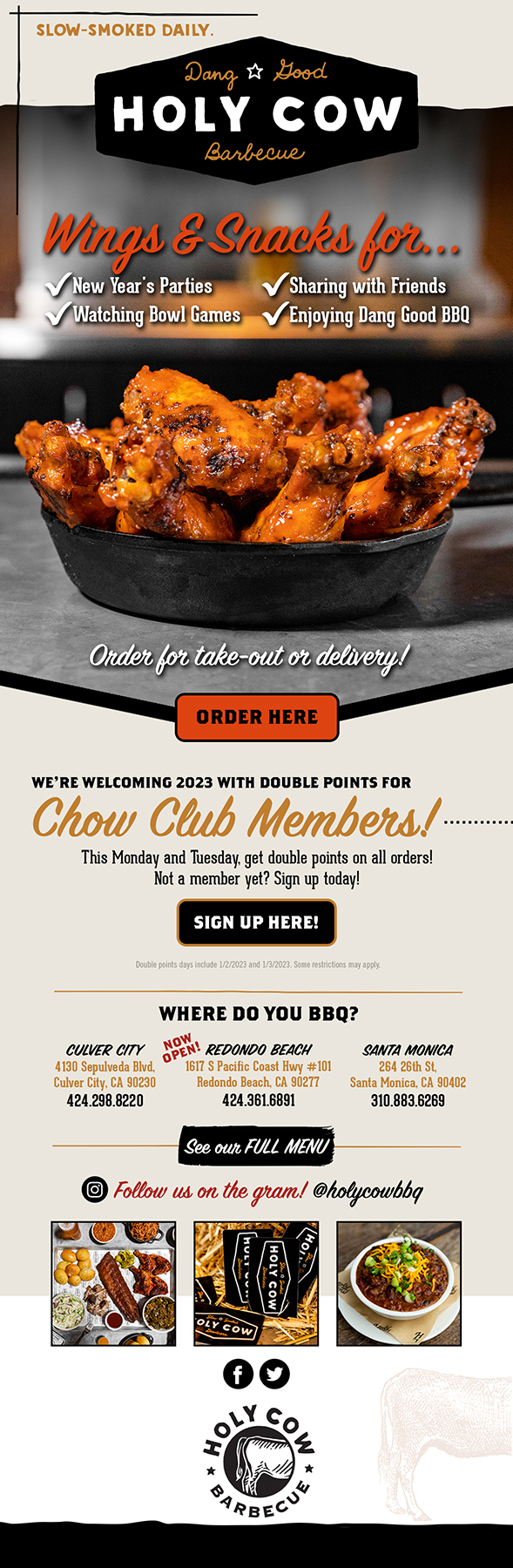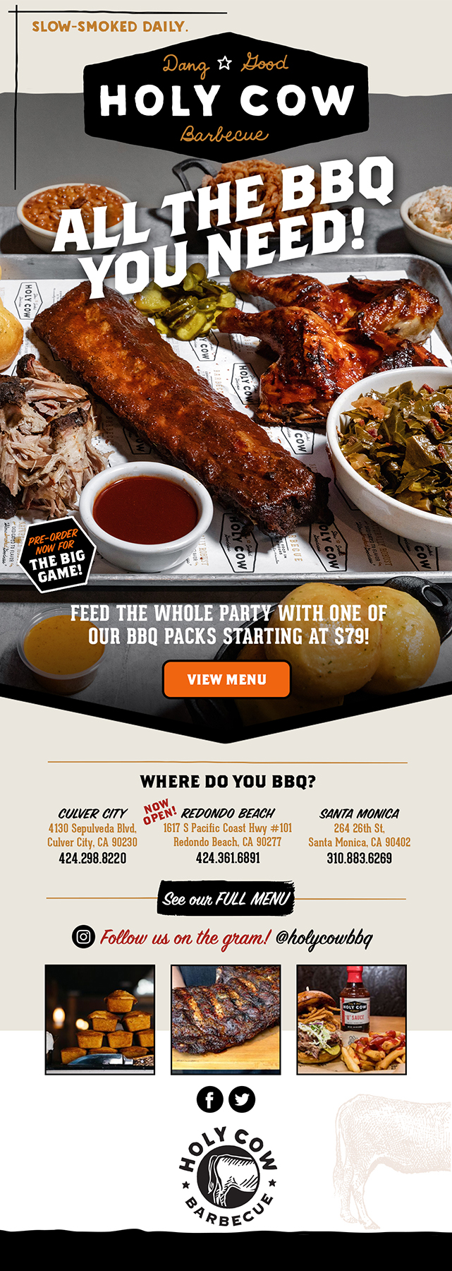 Newman Grace was the agency on record for Holy Cow BBQ, acting as their complete outsourced marketing department for 4 years. During this time, they owned and operated 3 locations and we managed the marketing & advertising for all 3 locations. As part of the marketing team for Holy Cow BBQ, I worked with our team to manage Holy Cow’s social media presence, strategize on promotions, planning/copywriting/designing promotional email campaigns, maintain & update their website, and strategize and execute in-store promotions.