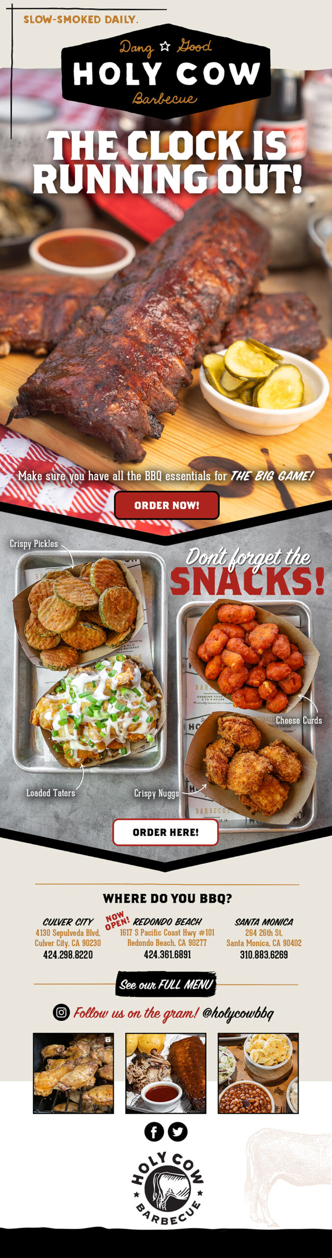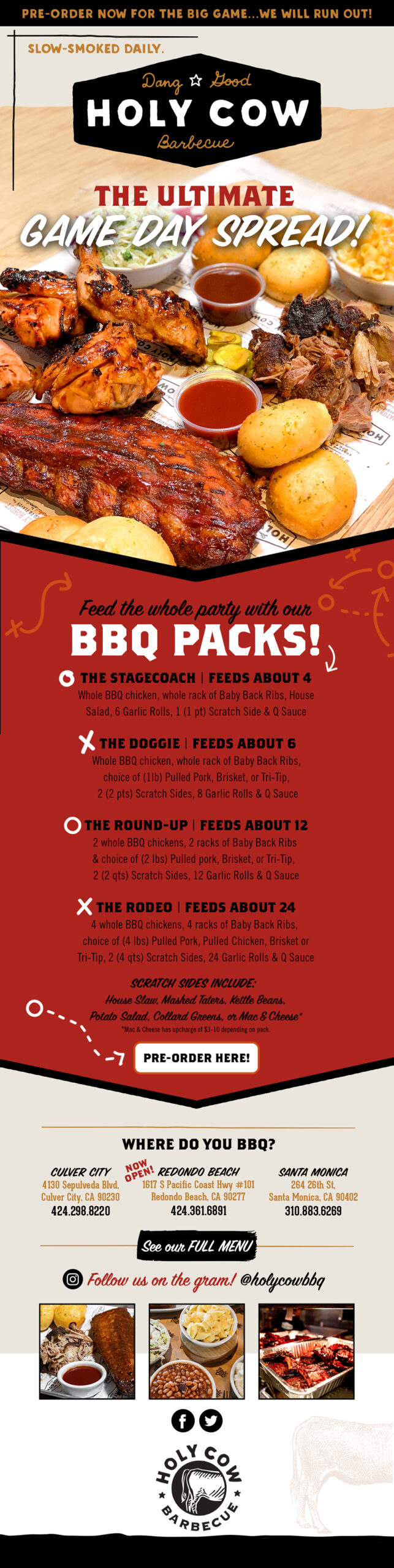 Holy Cow BBQ is a local barbecue restaurant based in Los Angeles, CA offering scratch-made, delicious BBQ!